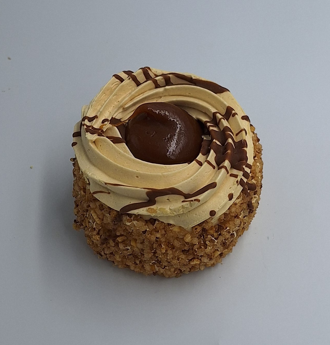 Hazelnootschuim gevuld en opgespoten met Caramelcréme en een dop Caramel. Voor de zoetekauw (: