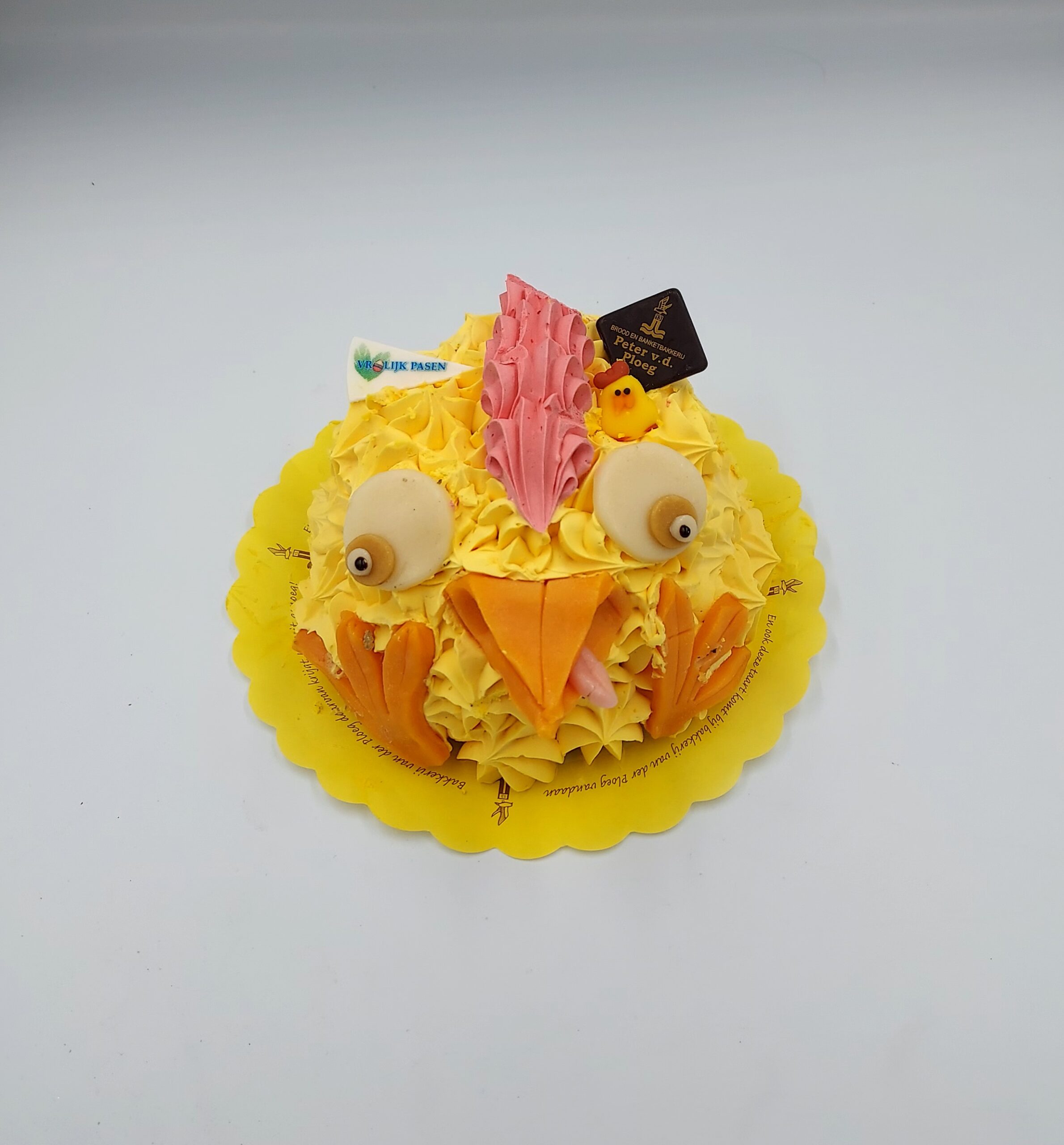 Paaskuiken is gevuld met Aardbeienbavaroise en opgespoten met créme