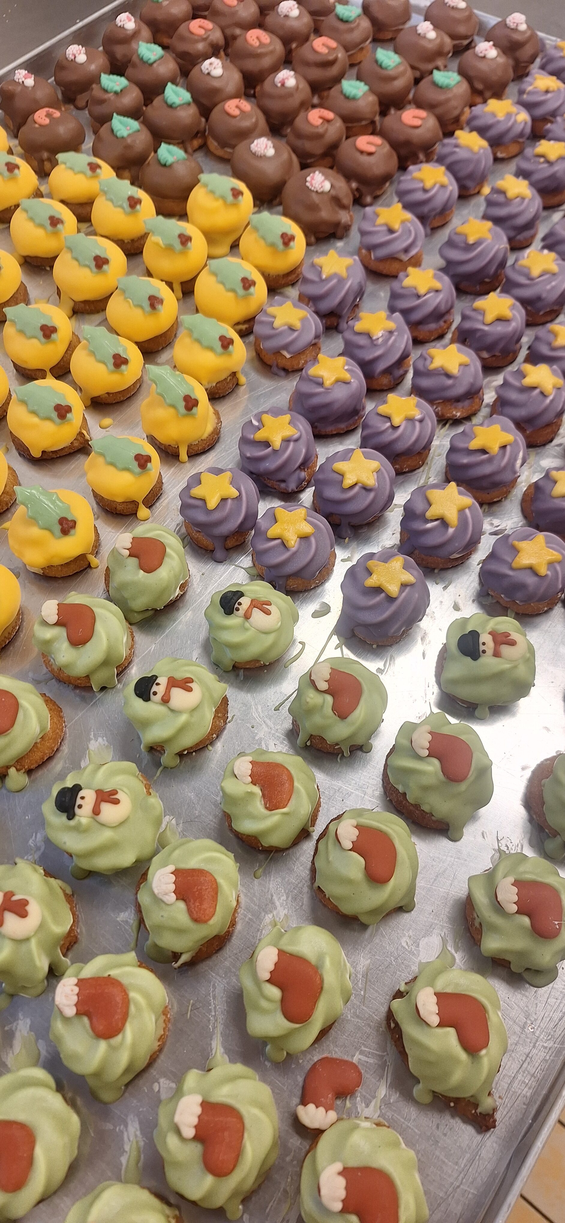Amandelbitterkoekje opgespoten met créme in de smaken Chocolade, Pistache, Advocaat of Bosbes.